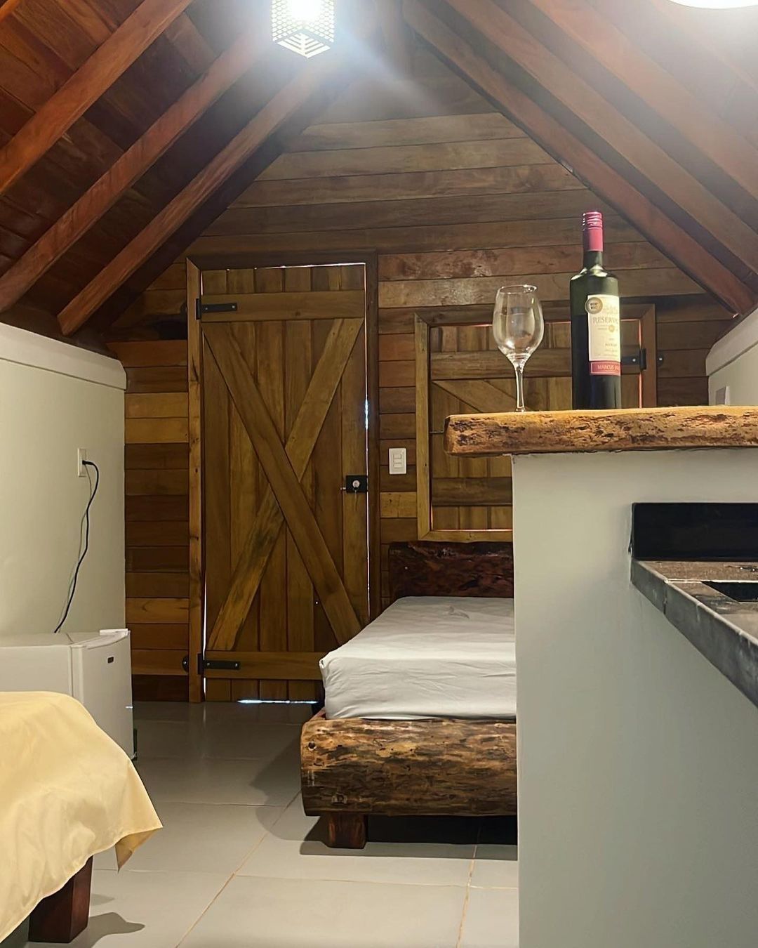 Chalé com cama de casal e uma cama de solteiro. Frigobar. TV. Ar Condicionado. Varanda. Banheiro privativo.