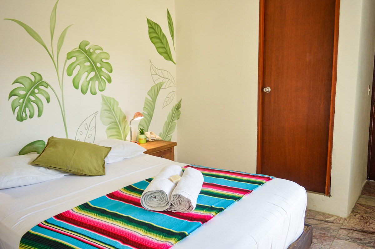 Casa Cielo Cancún is an hostal located downtown Cancún, distance walking to restaurants, local bars, bus stop and the entrance of the hotel zone. Private bedroom with a king size bed, private bathroom, smart tv 55'' and air conditioner. This room is in the second floor. The hostal has a shared pool, full equipped kitchen and dinning room or co-working area with smart tv and A.C. Few minutes to the beach! (By bus/taxi) 1.5 km to bus terminal ADO.