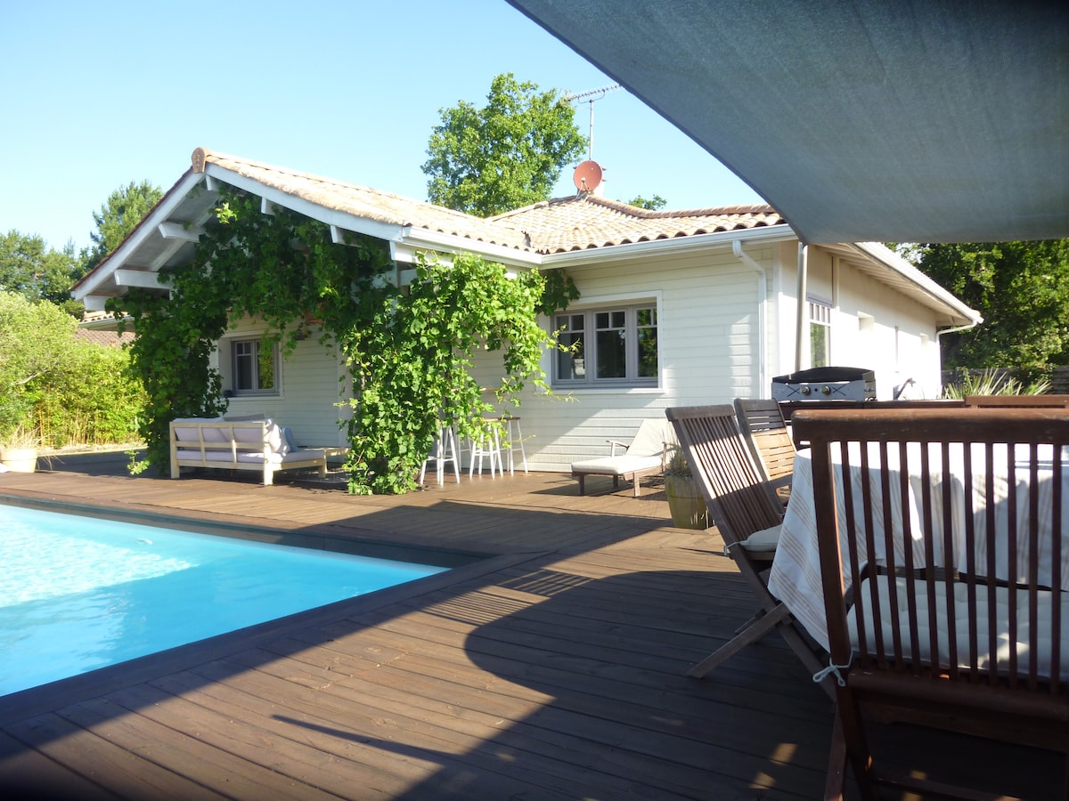 10人用の建築家のヴィラ、エアコン完備。近所の商店やアルカション湾のビーチ(グランピケイ村)から徒歩5分以内の場所にあります。 海岸へは車で5分 (キャップフェレットの中心部から15分) 5月15日から9月15日まで、気候条件や悪天候に応じて加熱される15mの温水プール(この期間の前後は、冬眠および/またはカバーされます) 緑の本当のココン