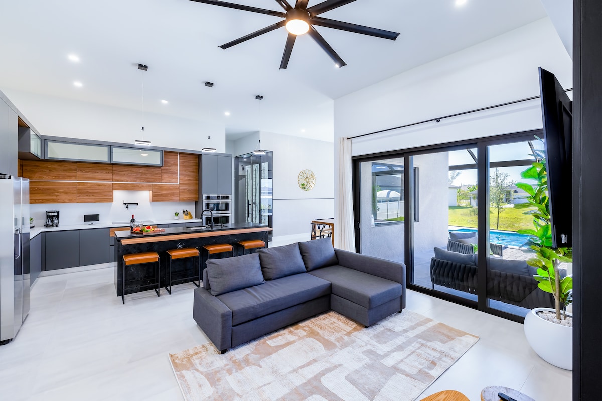 🌴2025年新築のケープコーラルのゲットアウェイ–専用プール。 2025年に新築されたモダンな4ベッドルームヴィラで思い出を作りましょう。専用プールと屋外プロジェクターが備わっており、星空の下で忘れられない映画の夜を楽しめます。ビーチやウォーターパークからわずか数分!最高のロケーションです! ✔パイン島のボートと釣りまで10分 ✔ウォーターパークまで10分 ✔フォートマイヤーズビーチとサニベルまで25分 ✔スクリーン付きプール ✔ バーベキューグリルとフルキッチン ✔スマートテレビと高速Wi-Fi ✔ ビーチギアをご用意しています ✔ペット連れ&ファミリー向け🐾
