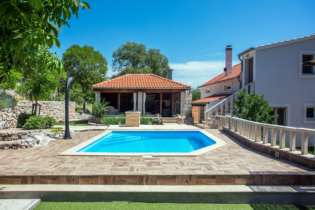 ヴィラ・ビスコはダルマチア・ザゴラの自然環境に囲まれています。美しく機能的に装飾されており、家族で快適に過ごせる休暇に適しています。1階と2階は内部階段でつながっています。 家の1階には、さまざまな器具、ビリヤード、子供用の遊び場を備えたレクリエーションスペースがあります。各客室にはエアコンが備わっています。家の前の美しいプール(10 x 4)とバーベキューグリル付きの屋根付きテラスの下でリラックスできます。この物件は都会の喧騒から離れており、畑や山の美しい景色を眺めることができます。