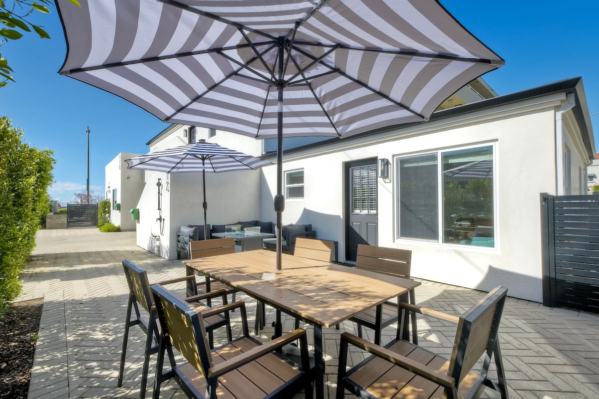 Beachside Bungalow is located in the heart of Carlsbad Village just steps away from the beach, restaurants, and bars. It is newly renovated with two outdoor lounging/dining areas and includes covered reserved parking, a king-size bed, a queen-size sofa bed, fast wifi (WFH friendly), large smart TV, a fully equipped kitchen, beach accessories (chairs + towels), and AC in the bedroom so you can sleep comfortably all summer long.
