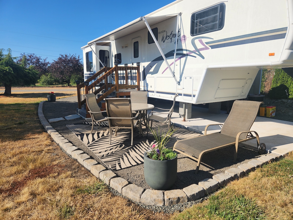 改装された37フィートのフィフスホイールは、オリンピック半島での滞在中にゆっくり休むことができる広々とした快適な場所です! オリンピック山脈の美しい景色です! オリンピック・ディスカバリートレイルからわずか数ブロックです。 日の出と夕日の両方を楽しむことができます! 寝室にはクイーンサイズのメモリーフォームマットレスがあります。 Crate & Barrelのスリーパーソファはクイーンサイズのメモリーフォームマットレスです。 一年中快適な温度調整ができるHVACダクトレスユニットをご用意しております。 雰囲気のための電気暖炉。