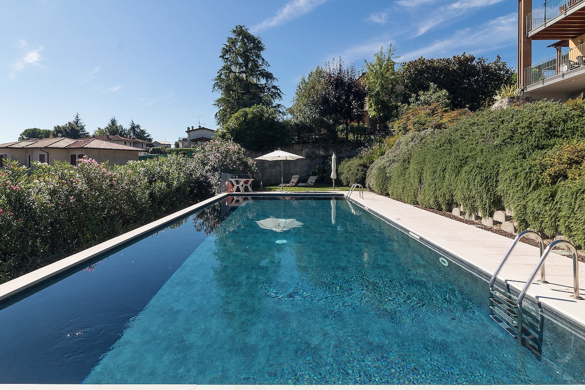 ガルダ湖のパノラマビューが楽しめる、プールと庭に直接アクセスできる54平方メートルのアパートメント。最高の立地で、プライバシーが確保されています。 庭とプールのご利用、広々とした屋外スペースでのプライバシーとリラックス。 2015年に建てられたモダンな建物。 専用玄関、広い駐車場。 徹底的な清掃。 完全なプライバシー。 小型のペット可。