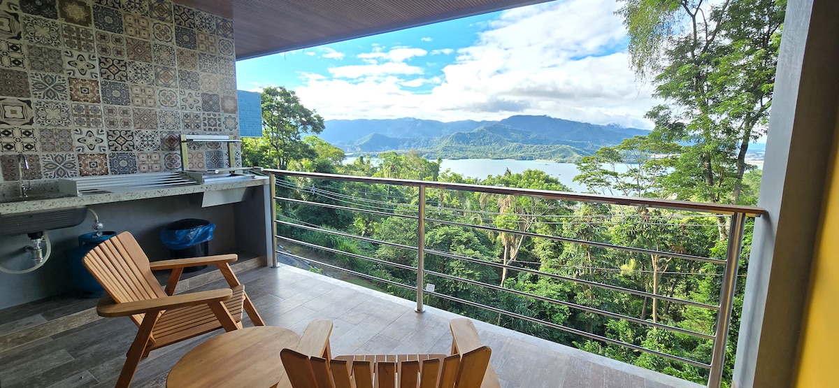 独立したエントランスを備えた敷地内の1階にあるフラット2(36m²)。敷地内の川と滝を見下ろすバルコニー。キングサイズベッドを備えた寝室には、4平方メートルのパノラマ天井があり、リモコンで開閉する天井のおかげで、夜は星が見え、日中は自然光が入ることができます。冷暖房エアコン、ファン、Netflix対応の43インチスマートテレビ、1Gbの高速ファイバーWi-Fi。240リットルの冷蔵庫、コンロ、電子レンジ、オーブン、バルコニーに簡単に運べる折りたたみテーブルを備えたコンパクトキッチン。