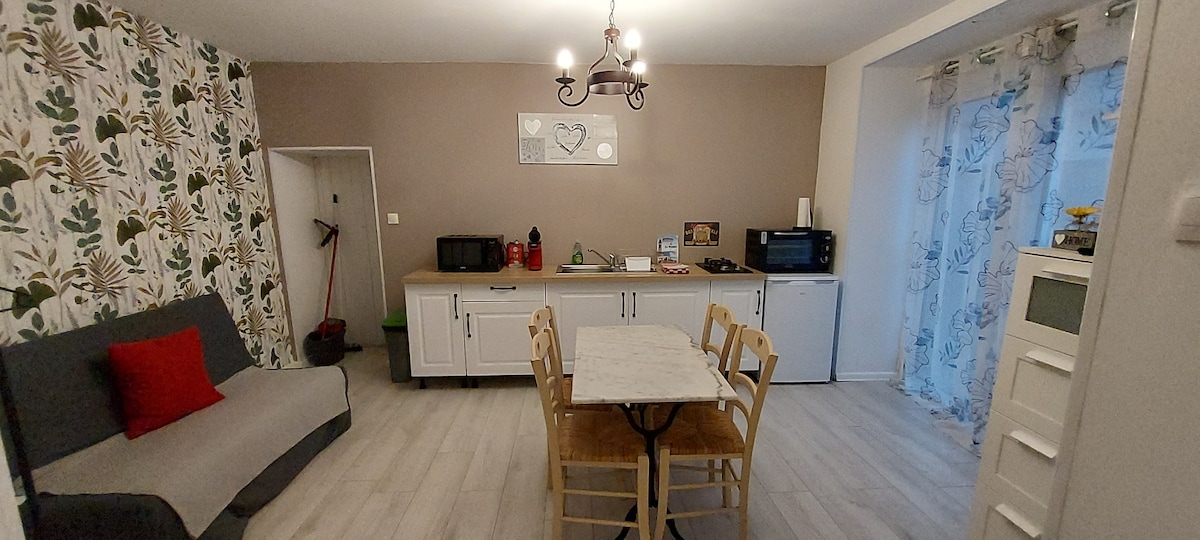 快適なワンルームマンション。設備の整ったキッチン兼リビングエリア、2つのシングルベッドがある独立した寝室エリア。バスルームとトイレ。このワンルームは最初のコテージに隣接していますが、独立したエントランスがあります。「シャン・デ・ダム」と「フォート・ド・コンデ」の近くのワンルームマンション。田舎の静けさを保証します!