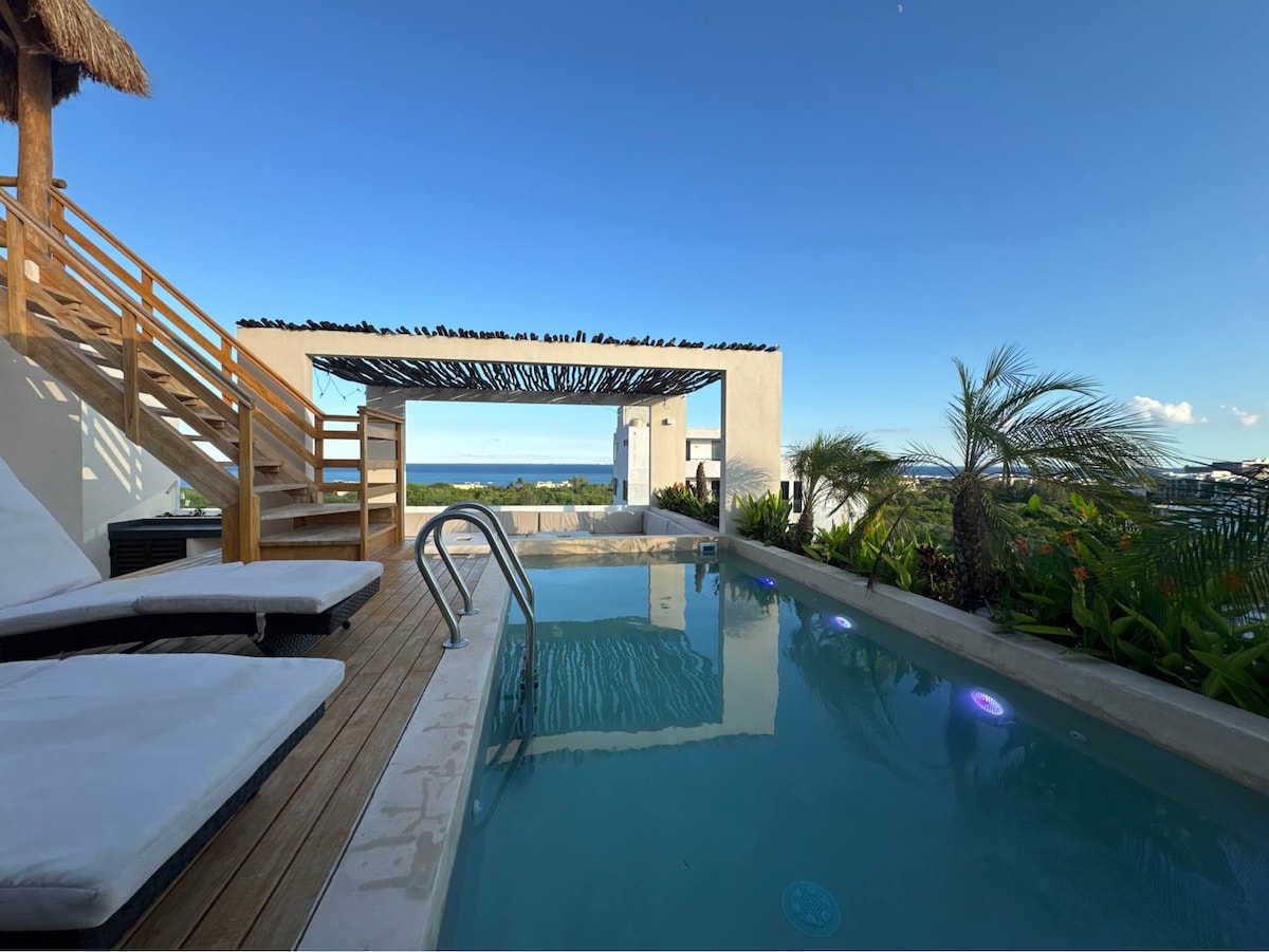 Cielito Lindo is a PH Studio just in the heart of Playa Del Carmen. With an oceanside view and just less than 450 meters away from the beach. Cielito Lindo is fully equipped with all your needs. Enjoy a private balcony, a second floor in the same unit with a Private pool, an area to BBQ, and enjoy a great evening. With also access to common areas such as a GYM, SAUNA, and INFINITY POOL. All within the walking distance of the majority of restaurants, supermarkets, branded stores, and nightclubs.