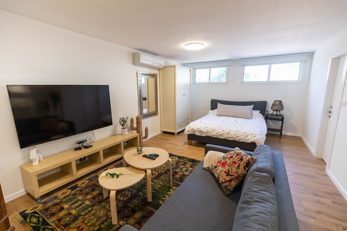 小さな庭がある静かで素敵な広々としたワンルーム。 ダブルベッド、電子レンジ、ネスプレッソコーヒーマシン、設備の整ったキッチン。 新しい洗濯機、Wi-Fi +ケーブルテレビ ライヒマン大学(IDCヘルツリヤ)から徒歩10分 ヘルツリヤビーチまで車で10分。 テルアビブから12 KM 公共交通機関は50メートル先にあります。ヘルツリヤ駅または市内中心部へのバスと公共電動自転車があります。 ゲスト専用玄関