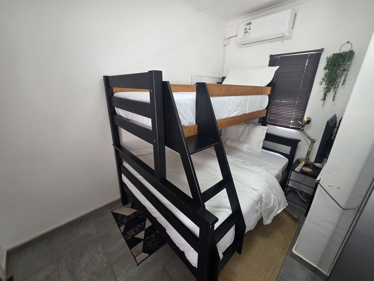Stay in a new, modern 1-bedroom apartment with a fresh, clean feel and crisp white bedding. The space is well equipped with almost everything you need for a comfortable stay. Enjoy a beautiful garden, secure surroundings, and plenty of parking. Centrally located in the village and not far from the mall, offering both convenience and peace. Ideal for guests visiting for weddings, funerals, or work trips, as well as short getaways.
