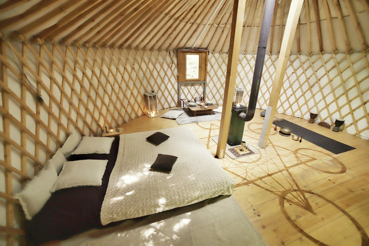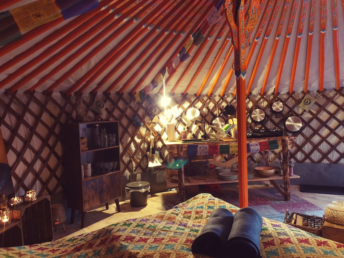 私たちのユルトは、2つの世界の長所を兼ね備えています。アパートのような快適さと、キャンプのような自然との距離を感じることができます。断熱材と暖炉が、あたたかく快適な暖房を提供します。円形テントならではの雰囲気を味わうことができますが、お湯、電気、シンプルなキッチン、暖房付きのバスルームも完備しています。広い庭やテラスでリラックスしたり、周辺の美しい環境を探索したりできます。