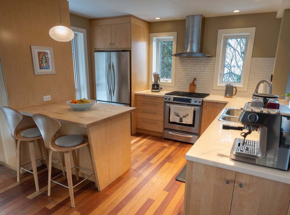 Unwind at this picturesque mountain retreat, with stunning panoramic views of Kootenay Lake, Nelson City, and the surrounding forest. The house features cherry floors, fine carpentry, and stunning views for a luxurious charm. It has three bedrooms upstairs, an open main floor with a sunken living room, and a private top deck with a hot tub, outdoor shower, and sauna, surrounded by trees. Please note that the main floor apartment is separate from the Airbnb.
