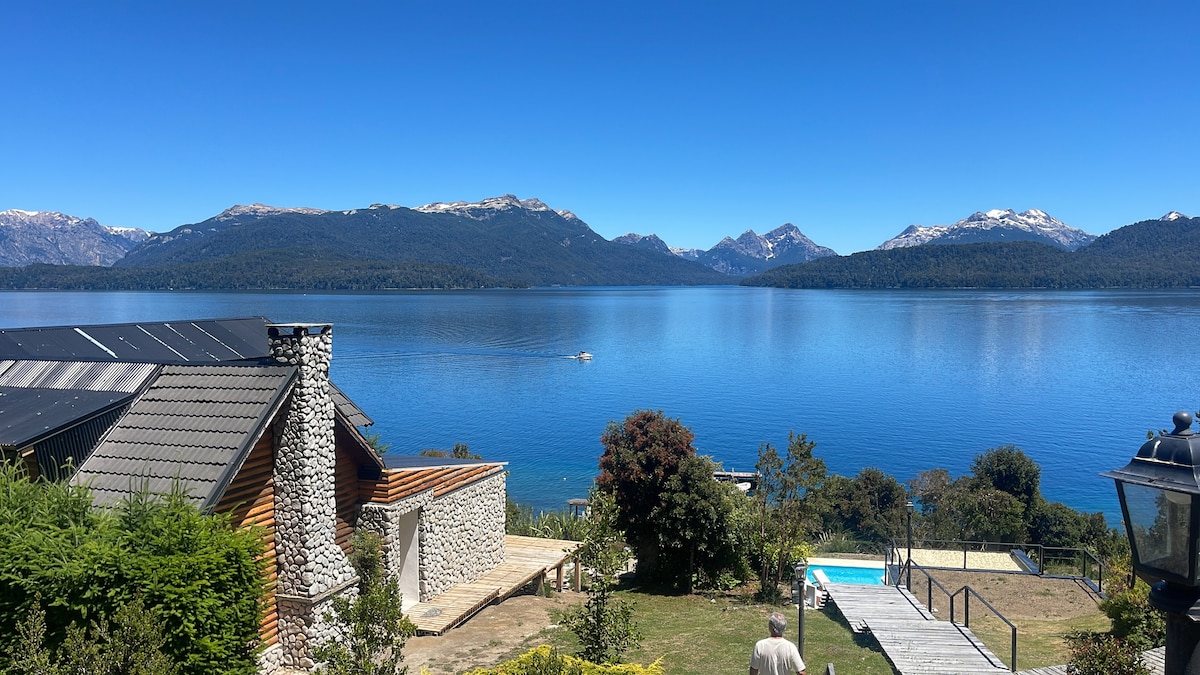 Casa en Villa La Angostura con espectacular vista al lago en barrio Bandurrias. El río correntoso está a 1.9km caminando, el Nahuel Huapi a 2.1km el Espejo Chico a 5km por el sendero del camino viejo. Tiene 3 dormitorios, dos baños completos más toilette de recepción. Cocina súper equipada. WIFI y cable por fibra óptica. Smart TV. Generador eléctrico. Parrilla y fogonero. Calefacción losa radiante. Aires acondicionados y hogar a leña. Inmenso deck con vista al lago y mobiliario de exterior.