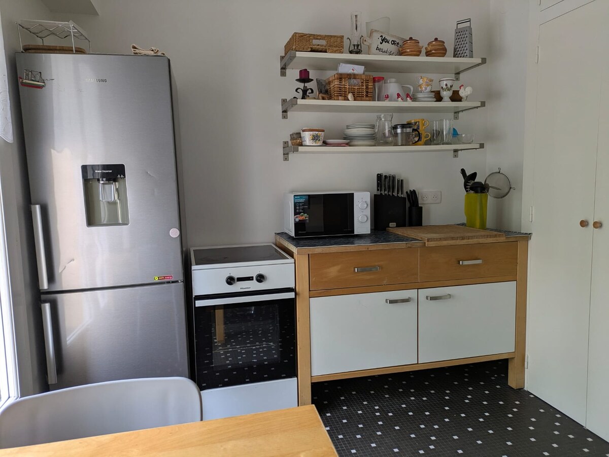 市街地にある50m²の一軒家、2名様用、閑静な通りに位置しています。 ・ 心地よいお部屋でゆっくりお休みいただけます · 目の前に無料の公共駐車場 · 朝食のクロワッサンを買うためのパン屋さんまで300m 🥐 · スーパーマーケットまで徒歩7分 · 向かいに建物がない日当たりの良いテラスでリラックス · 夜のくつろぎのためのテレビ付きの居心地の良いリビングルーム 街の中心部にある便利で温かい巣穴は、カップルでの休暇に最適です