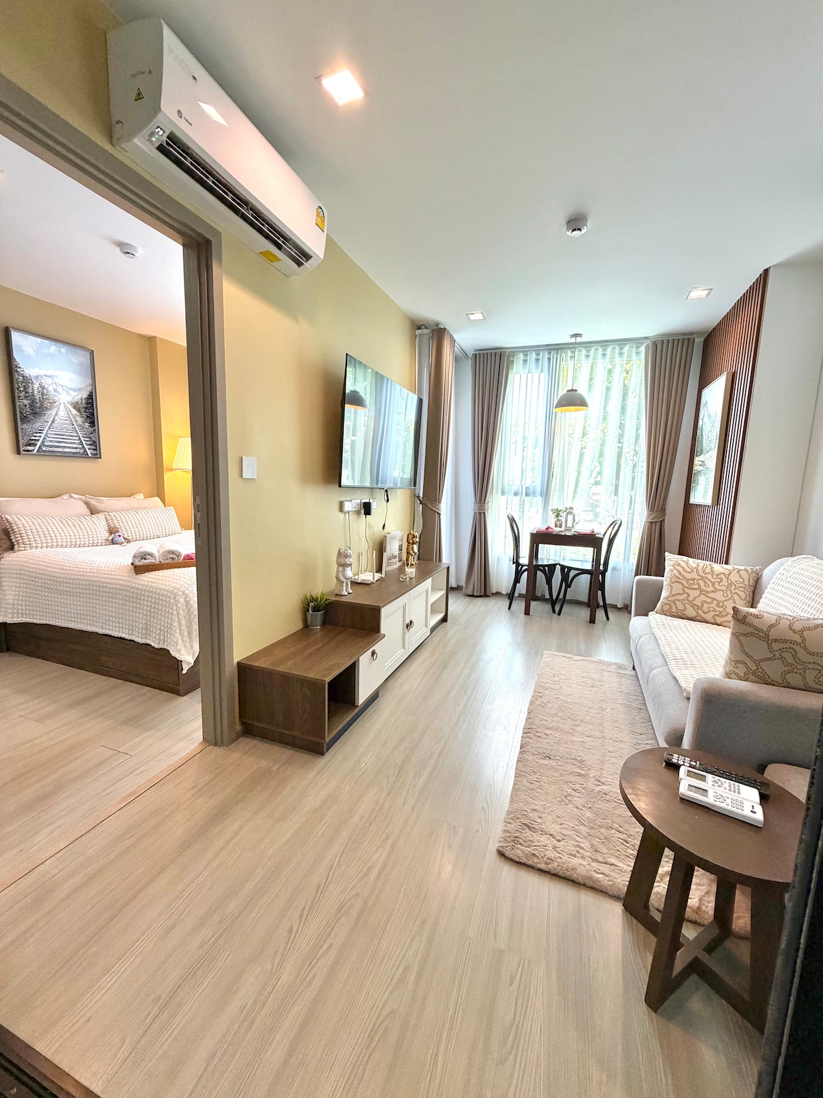 私たちのお部屋は、家具が完備された1ベッドルームのコンドミニアムで、ご自宅にいるかのようにくつろぐことができます。 一人旅の方やカップルの短期滞在にも長期滞在にも最適です。 プーケットのチャロンにあるチャオファーウェストロードにあり、ファミリーマート24時間営業のコンビニエンスストアからわずか50m、マーケットビレッジとロータスのコミュニティモールまで1km、タイガームエイタイキャンプまで3.5kmです。 コンドミニアムのアメニティ:無料Wi-Fi(50 Mbps/20 Mbps)、プール、駐車場、警備員、コインランドリー&乾燥機。