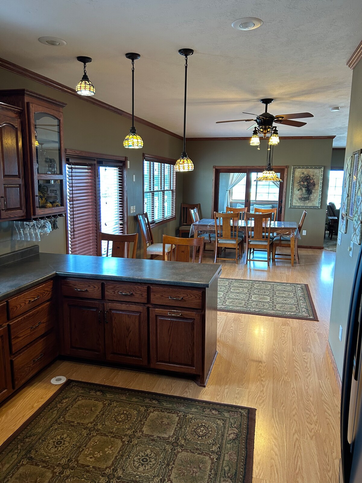 Just a block from the Missouri River and walking distance to boat ramps at American Creek Marina.. it’s a 7 bedroom (14 beds) 3 bath home, with large dining room for gathering, full kitchen featuring double oven range and coffee bar, additional upstairs living room and kitchenette bar area, large mudroom for all of your outdoor adventure equipment, and a separate “poker room” / party room and so much more!