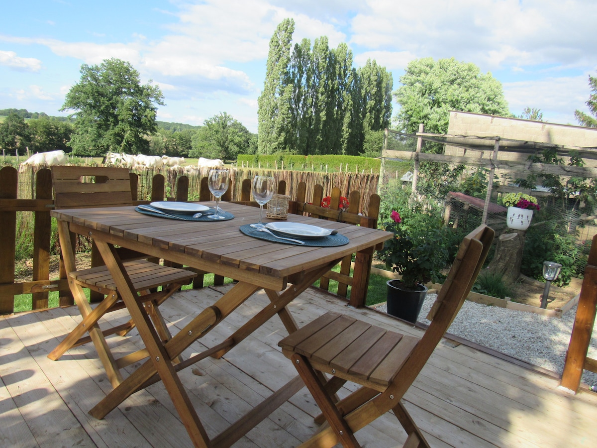 一味違った滞在をお求めですか?この小屋は、二人だけで逃避するのに理想的な場所です... ここは、職人の大工によって作られた、温かいキャリッジです!ここでは、最大限の快適さを提供するためにすべてがカスタムメイドで作られています。朝、鳥のさえずりで目を覚まし、テラスで朝食を食べ、畑やハイランド牛の景色を眺めましょう。散歩に出かける前に、屋外の北欧風呂でリラックスしてください。