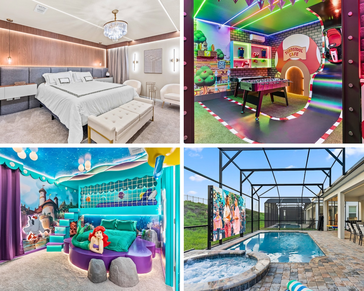 期間限定オファー - 4月1日までにご予約いただくと、プールの暖房(1泊あたり30ドル相当)が無料になります ✦ディズニーワールドからわずか数分🏰 ✦ 8寝室、16名様用 🛌 ✦ 南向きのプールとジャグジー!☀️ ✦ ゲーム:75インチ4Kテレビで1,000以上のクラシックアーケードゲーム、屋内バスケットボール、エアホッケー、PS5、Xbox Series X 🎮 全館に✦スマート4Kテレビ ✦ 100インチ以上のホームシアタースクリーン 🎬 ✦ 手描きのアナと雪の女王とアベンジャーズをテーマにした寝室 ✦ 超高速Wi-Fi ウォーターパーク付き✦チャンピオンズゲート・クラブハウスへのアクセス 🏖