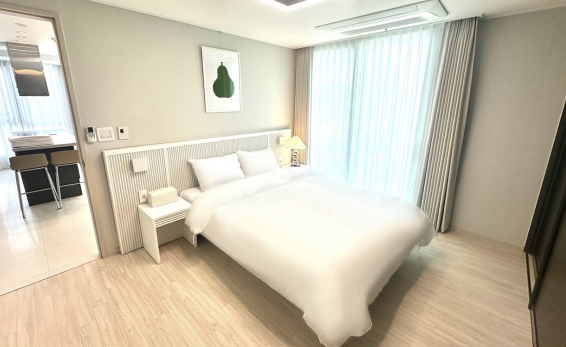 釜山のチャガルチ駅3番出口のすぐ前に位置する客室です。 クイーンベッドが設置されており、客室からは美しい北港大橋と海の景色を楽しむことができます。 朝の澄んだ海の景色まで、すべてを楽しめる最高の眺望を誇ります。 ビーフ広場、カントン市場、チャガルチ市場などの釜山の主要観光地が徒歩圏内にあり、便利な旅行が可能です。 周辺にはコンビニエンスストア、カフェ、レストラン、薬局などのさまざまな便利な施設が整っています。 無料の高速Wi-Fiと24時間体制の警備員が安全な滞在をサポートし、全エリア禁煙で快適な環境を維持しています。 冷蔵庫、洗濯機、スマートテレビなどが完備されており、長期滞在にも適しています。 3泊以上のご宿泊の場合は、リネンと客室清掃サービスが提供され、非対面チェックインとテキストメッセージによるコミュニケーションにより、便利で安全な旅行を保証します。 * 重要:本館には専用駐車場がございませんので、徒歩5分の近くの私有駐車場(JS駐車場など)をご利用ください。