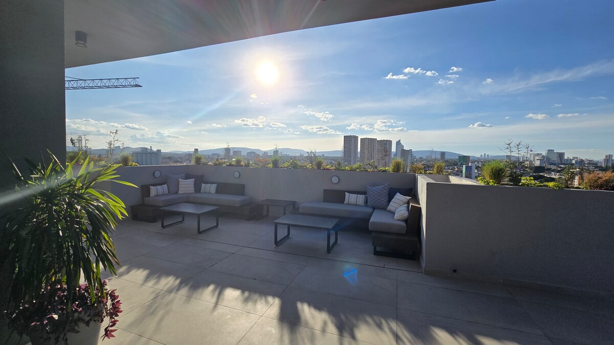 グアダラハラを上空から楽しもう: グアダラハラで最も活気があり、人気のあるエリアであるコロニアアメリカーナの中心部に位置する、パノラマビューを楽しめるモダンでスタイリッシュなアパートで、比類のない滞在をお楽しみください。出張、ロマンチックな旅行、長期滞在に最適なこのお部屋は、快適さ、スタイル、機能性を提供するように考え抜かれて設計されています。 屋上にはラウンジチェア付きの温水プールがあり、一年中リラックスするのに最適です。