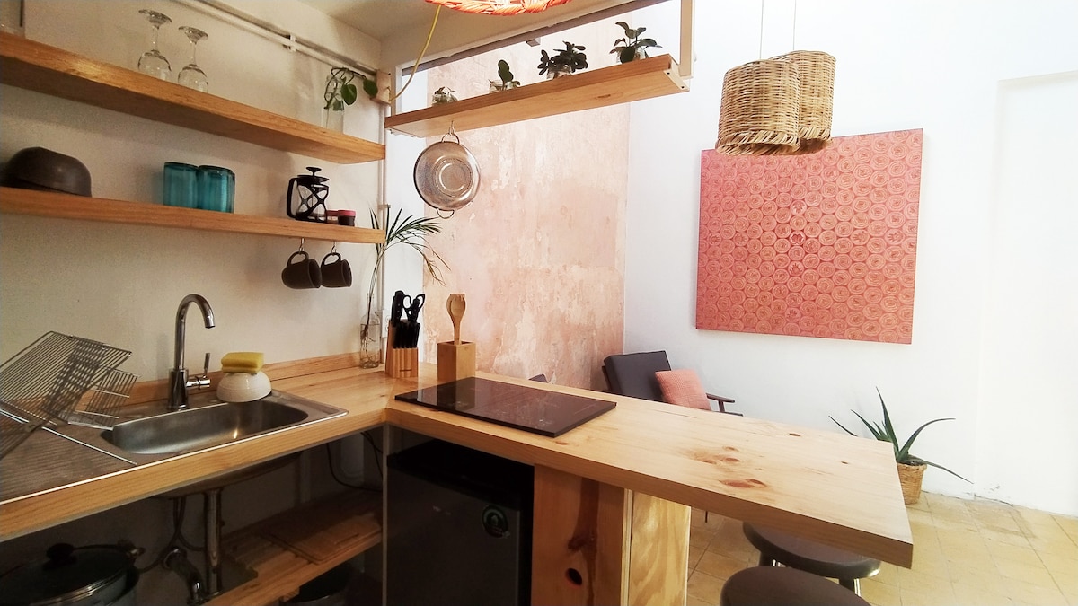 散歩や一日のスタート地点を、異なるスタイルが融合した壮大な空間に。カラフルな素朴な家具が、このモダンなアパートに命を吹き込みます。バルコニーは宝石のようです。 ワンルームタイプのアパートは、すべての活動が相互に繋がり、広々とした空間を感じることができるオープンスペースです。屋内空間には非常に明るく、市街の素晴らしい景色を眺めることができる大きな窓があり、テラスとのつながりをいつでも楽しむことができます。あなたの家になり、私たちの最大の願いは、それを最大限に楽しんでいただくことです。お待ちしています! 1階には、薬用植物や食用植物の多種を楽しむことができる都市型菜園があり、個人的な使用のために有機栽培を行い、滞在を豊かにすることができます。 この場所はとても素敵な空間で、大変愛情を込めてデザインされたものです。ぜひ体験して楽しんでいただきたいと思います。お待ちしております! 私たちにとって、ゲストの滞在と快適さが最も重要であり、ゲストのニーズに迅速に対応します。ゲストを心待ちにしております。このアパートは間違いなく最良の選択肢です。 アパートは、グアダラハラを体験するのに理想的な、静かで文化的で美食的なエリアにあります。フアレス市場やメキシコ市場から3ブロック、歴史地区から徒歩20分です。 徒歩で移動して街を散策することをお勧めします。アパートは、歴史地区、パセオ・チャプルテペックのすぐ近く、静かで文化的で美食のあるエリアにあり、グアダラハラを体験するのに最適なロケーションです。 私たちの美しい街の魅力の多くは、交通費をかけずに楽しむことができます。 アパートに住む感覚はとても心地よく、快適です。窓を開けると、テラスと一体化したスペースがあり、とても楽しめます。 夜にはテラスから遠く離れたところで飛行機が離陸するのが見え、それは楽しめるショーです。 自由通りやフアレス市場周辺(テラスから左に曲がると2ブロック先に見えます)では、多くのカフェで美味しい朝食を楽しむことができます。その大多数は木や植物のあるテラスがあり、とても素敵で落ち着いたひとときを過ごすことができます。
