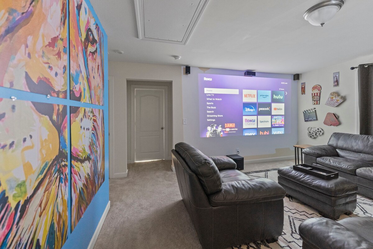 寝室5部屋、ベッド8台、バスルーム5.5室を備えたモダンな3階建てのリゾートにご滞在ください。大人数のグループや家族に最適です。Meta Quest 2とエアホッケーを備えたゲームルーム、エレガントな黒と白と金のインテリア、広々とした快適な寝室をお楽しみください。このシックなキャリーの隠れ家で、スタイリッシュにリラックスし、充電し、忘れられない思い出を作りましょう。今すぐ宿泊先を予約しましょう!ローリー、RTP、ローリー・ダーラム国際空港に近い。無料駐車場、セルフチェックイン、焚き火台とブランコを備えたプライベート裏庭。グループでくつろぐ夜に最適です」