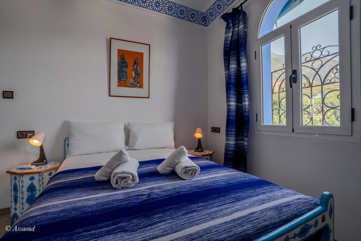 青い街と山々を見下ろすテラスルームで静寂を体験しましょう。素晴らしい街の景色を望むこの静かなオアシスでリラックスしましょう。伝統的なモロッコの環境でモダンな快適さをお楽しみください。シャウエン滞在中の静かなひとときに最適です。カップルに最適です。