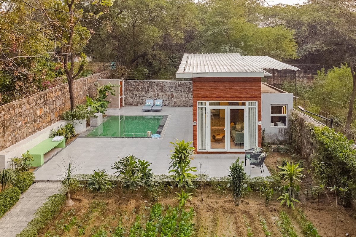 Mind Expanding Space, a Secret Hide-Out Bedroom & Jacuzzi (charges extra)- located in the Heart of South Delhi-Gk1 (LaneNo.1, N-57-Gk1) is a 1BHK Bedroom Suite with attached toilet, overlooking a large Jacuzzi , a Sun Lounger deck for sunbathing with outdoor shower. There is a Outdoor Kitchen with Dining area, Weber BBQ, herb gardens and a lawn with a Daybed and Swing. Equipped with SwimSpa Pool 16'x8' ft / Large Private Jacuzzi, surrounded by grass walls for full privacy. Total area:1100Sqft