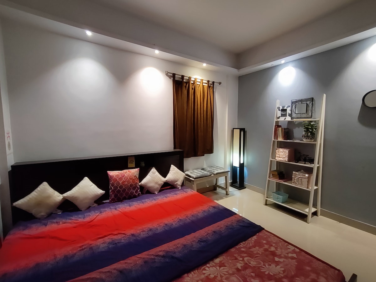 ホームシアターの雰囲気を楽しめる1階の快適な1BHK!映画鑑賞に便利な大型プロジェクター、冷蔵庫、電子レンジ、浄水器、必需品がすべて揃ったキッチンをお楽しみください。寝室には、快適なキングサイズのベッド、エアコン、十分な収納スペースがあります。洗濯機、必需品を備えた清潔なバスルーム、Wi-Fi、セルフチェックインなど、便利な設備がそろっています。ペット連れの方にも、カップル、一人旅、長期滞在の方にも最適です。共有スペースのない専用ユニットです。現地の身分証明書は受け付けておりません。
