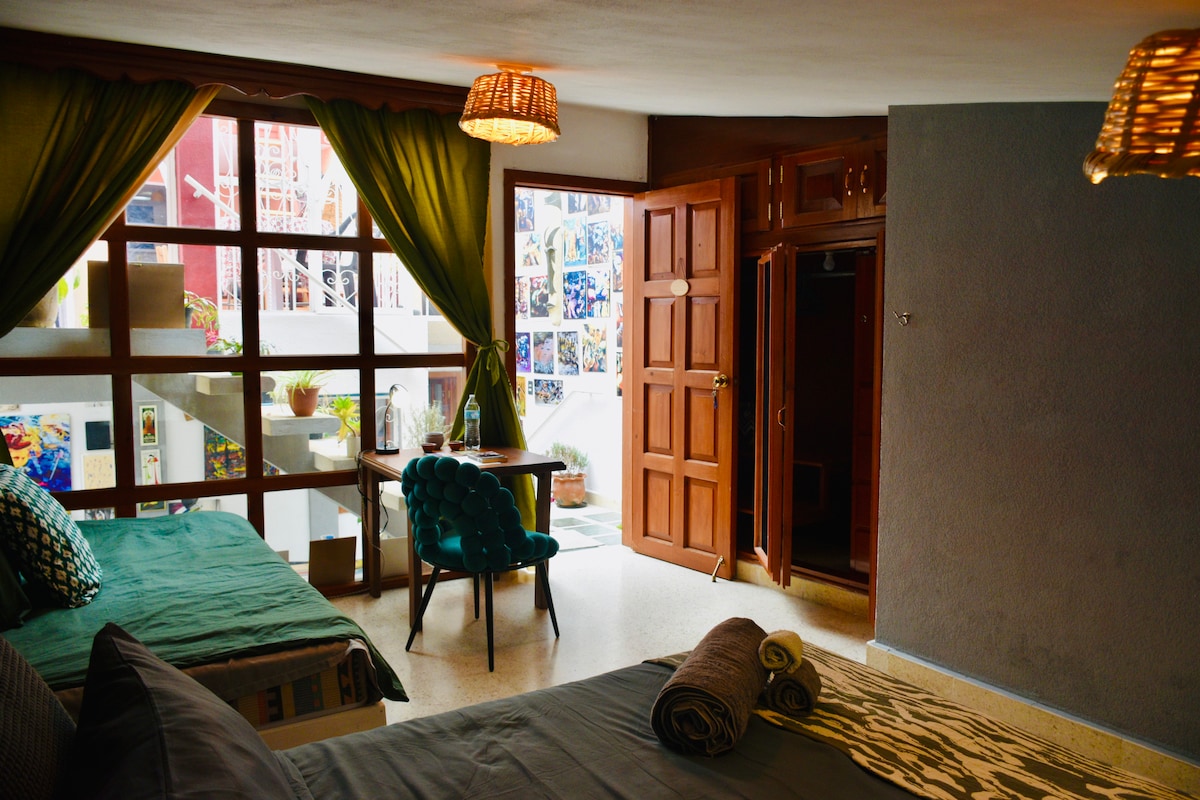 Mariscalは、サン・クリストバルで平和、アート、そして一時的な家を求める人々のための居心地の良いテラスルームです。暖かい空間とダイアナ・マリスカルのグラフィックアートが施された壁がユニークな雰囲気を醸し出しています。 ダブルベッドには形状記憶マットレスが備わっており、フルバスルームは2階にあります。 Mariscalは、それぞれに独自の雰囲気を持つユニークなお部屋を備えた芸術的な家、Casa Nazimovaの一部です。こちらのお部屋がご利用いただけない場合は、他のお部屋もぜひご覧ください。