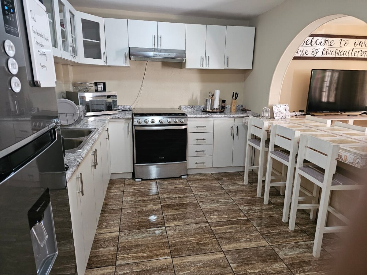 ボスケス・デ・テクパンにあるこの居心地の良い家には、クイーンベッド、フルバスルーム、クローゼットを備えた2つの寝室があり、マスタールームには庭園を見下ろすバスタブがあります。リビングルームには暖炉とダブルソファベッドがあり、このスペースはダイニングルームと設備の整ったキッチン、そしてフルバスルームにつながっています。 デッキには屋外での食事用のスペースがあり、庭には焚き火用のエリアがあります。4つの閉鎖された駐車場と3つの無料駐車場があります。この家はPaseo Xejasminから1分、BonanzaとKatokから10分の場所にあります。