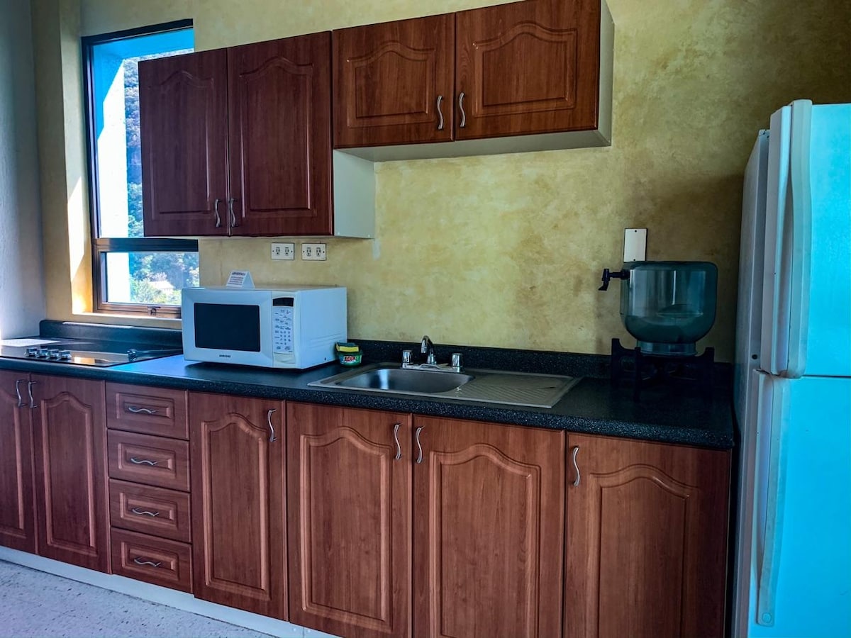 El apartamento, es muy cómodo y acogedor, completamente equipado, para que su estancia sea muy agradable. El apartamento se encuentra en el piso 11 y esto hace, que por la parte del frente, puedan tener la mejor vista al lago Atitlán, a sus volcanes y a los pueblos que lo rodean, y por la parte trasera, una hermosa vista a la reserva natural, cables extremos y mariposario. Además contamos, con restaurante, playa privada, muelle privado, piscina, jacuzzi, jardínes y salón de juegos para niños.