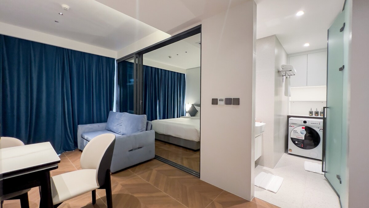 バンタオビーチ、ラヤンビーチに近いベルビューラグーンの7階建ての建物の2階にある、モダンで考え抜かれたデザインのスタジオアパートメント(35㎡)です。緑豊かな丘と田園地帯のパノラマバルコニー、鏡付きのユニークな回転テレビウォール、キングサイズベッド、設備の整ったキッチン、洗濯機、金庫、高速Wi-Fiをお楽しみください。プール、ジム、コワーキングスペース、駐車場、電気、3日ごとの清掃が含まれています。カップルやリモートワークに最適です。