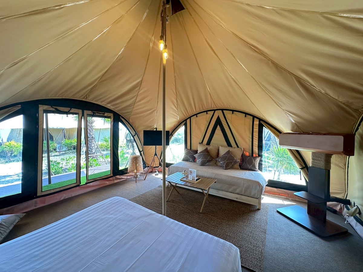 白い砂浜とタイ湾の景色を一望できる豪華なビーチフロントのサンクチュアリ。100平方メートルに及ぶ広々とした快適さのグランピングスイートに逃れましょう。この贅沢な宿泊施設は、豪華な1ベッドルームのテントと、追加のゲストを収容するために簡単に変換できる独立したリビングルームのテント、そして美しい景色を見渡す広いデッキと広々としたデイベッドで構成されています。