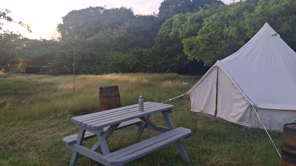 Spacious Canvas Bell Tent – Sleeps up to 6 guests with double air beds and linen, plus simple furniture. It offers plenty of headroom and natural light, while mosquito-screened windows and doors keep bugs out. On hot days, the tent walls can be rolled up to let in a refreshing breeze.