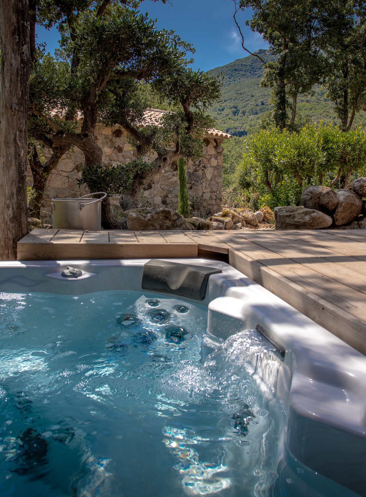 サリ・ドルシーノ村から数分のところにある、地中海を見下ろす、マキに囲まれた伝統的な石造りの羊小屋。 4名に最適なこの家は、専用バスルーム(イタリアンシャワー、独立したトイレ)付きの2つのベッドルームと、居心地の良いリビングに開かれたキッチンで構成されています。木製のテラスには、温水プール、ラウンジ、デッキチェアが備えられ、くつろぎのひとときをお過ごしいただけます。 岩と低木に囲まれた木製のテラスでは、より親密な雰囲気を味わえます。