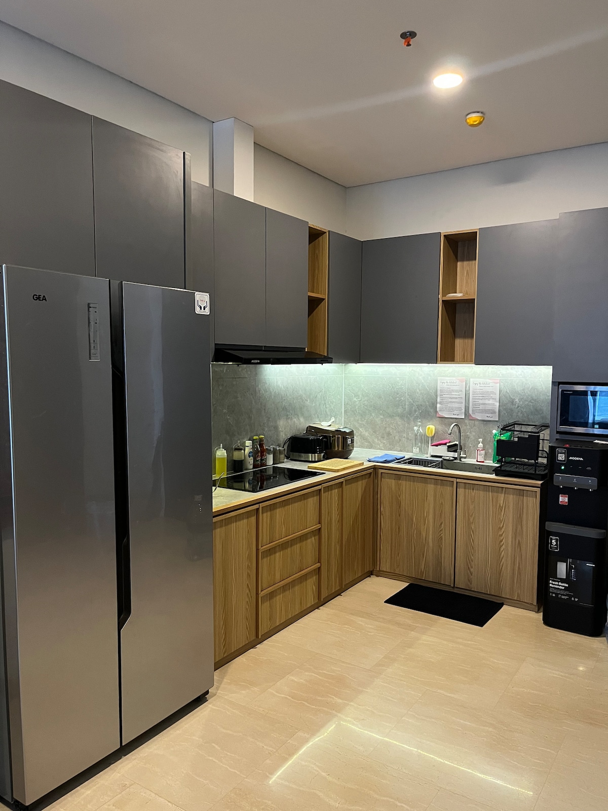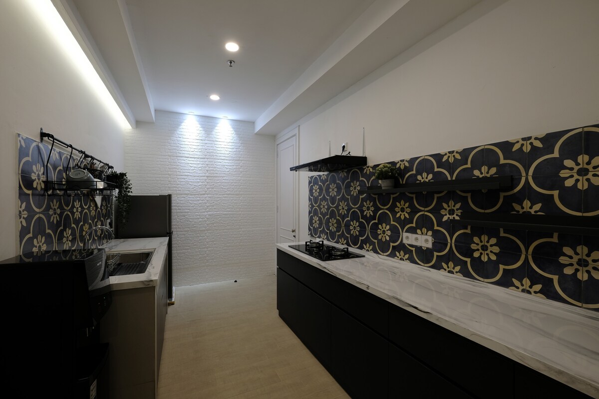Hi-speed wifi. Netflix. Long stay discount! 🚭 The only unique 2 BR corner suite with industrial chic design. Whether you stay for business or weekend staycation, we will ensure your comfort stay. This self-service NON SMOKING unit located on 32nd fl, boasting amazing view of Bekasi landscape, MBZ elevated road and LRT + high speed train. It has 2200 watt electricity, for 2 AC, fridge and complete kitchen utensils for 4 people. Lagoon Mall is directly below the apartment. Parking is NOT free.
