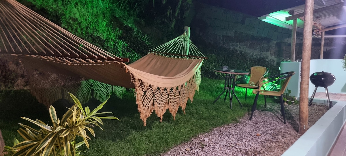 À 800 m da balsa esta casa é uma jóia: construída nos anos 70 à sombra de uma mangueira centenária, com paredes de tijolo duplo e mezanino em madeira de ipê. Está toda reformada para receber viajantes que buscam conforto em meio à natureza! Climatizada e com cozinha equipada, tem três quartos, sendo duas suítes. Tem três banheiros amplos. A sala tem Smart Tv e a copa tem seis lugares à mesa de peroba rosa. Lá fora, há churrasqueira, fogão e forno a lenha, mesa de jantar, rede e um lavabo.