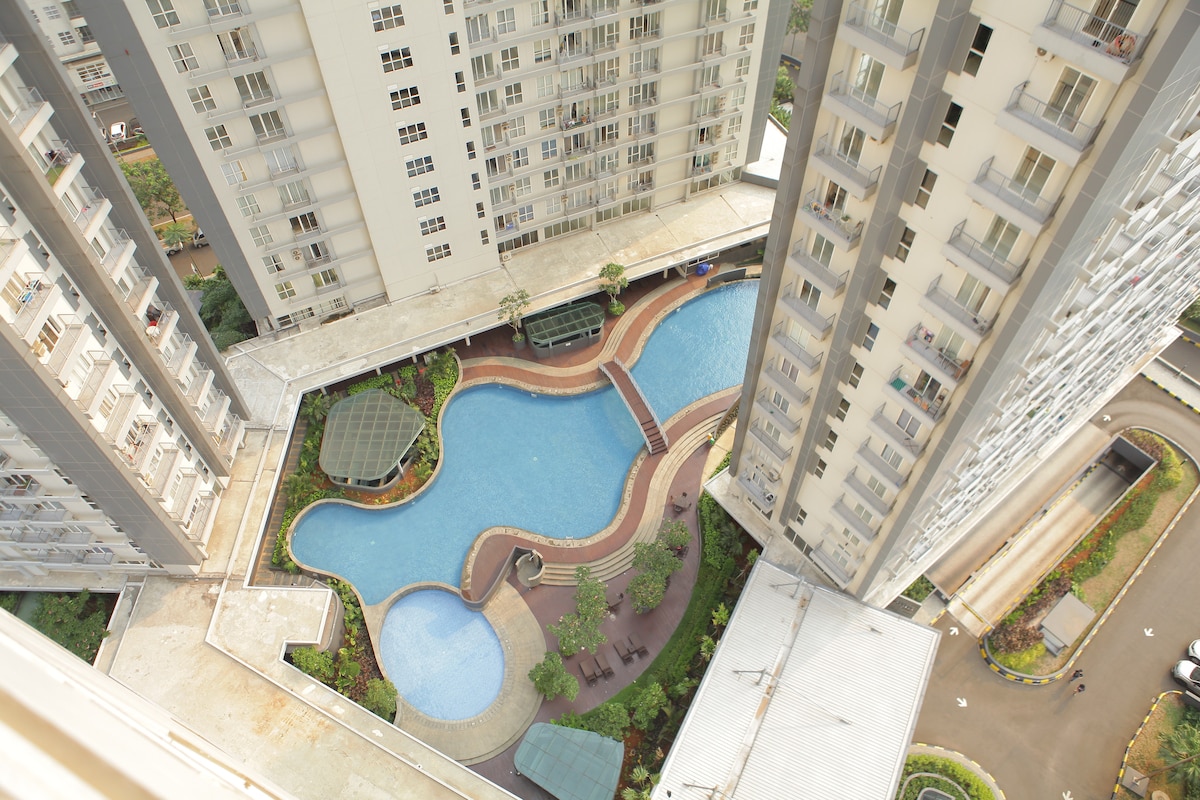 南ジャカルタのこの静かでおしゃれなお部屋で、のんびりとおくつろぎください。7ヘクタールのエコパークのすぐ隣です。 インダストリアルデザインの豪華なスタジオフルファニッシュアパートメント:設備の整ったキッチン(コンロ、冷蔵庫、ネスプレッソマシン、調理器具、食器)、43インチアンドロイドテレビ、ソファ、クイーンベッド、温水シャワー付きバスルーム。 建物の施設には、プール、ジャグジー、ジム、駐車スペースがあります。 22階からはジャカルタ市の絶景を一望できます。