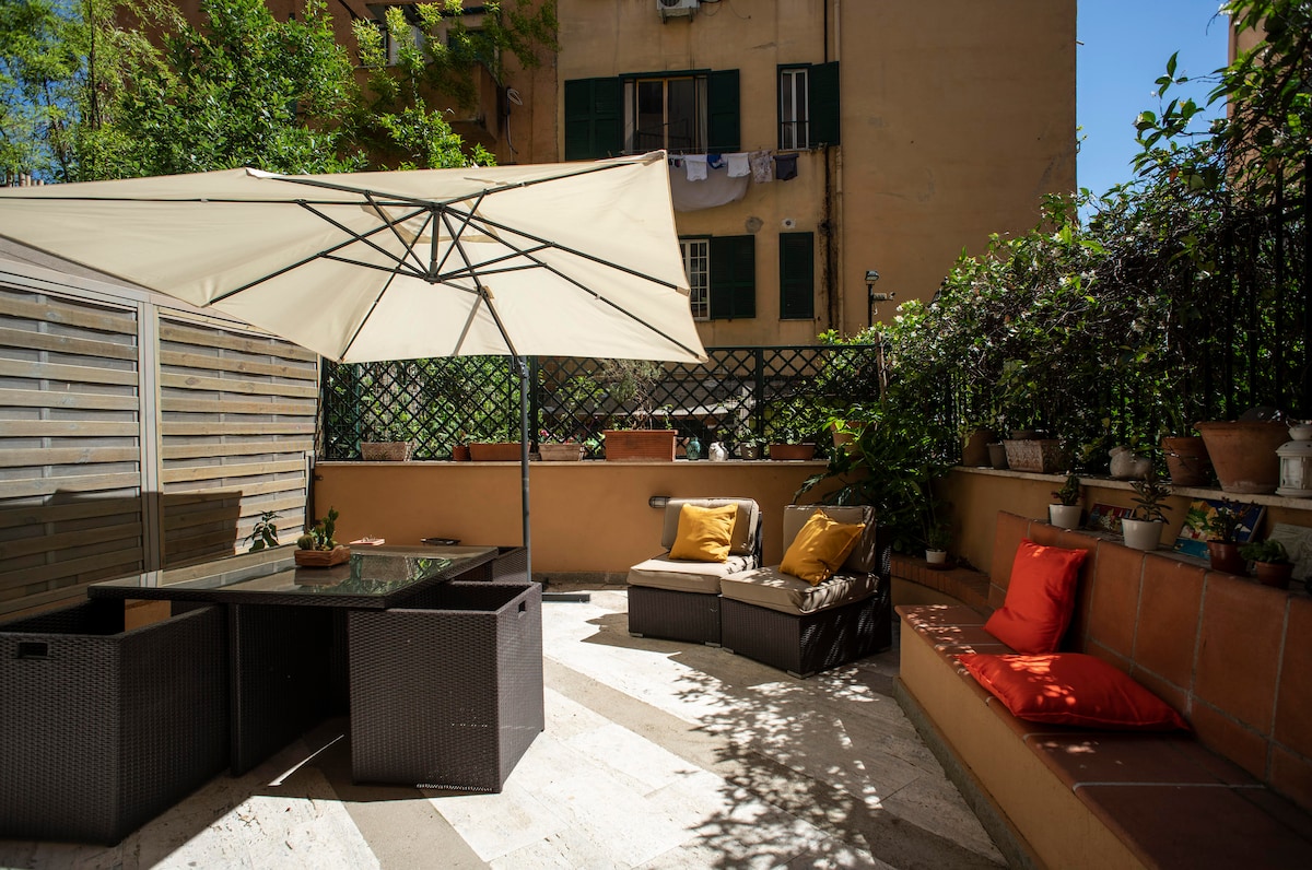 Bright and quiet penthouse apartment in the heart of Trastevere, with a wonderful terrace and an unparalleled view of charming roman roofs and the Gianicolo hill. The flat is meticulously refurbished and set in a picturesque cobblestoned street, just around the corner from the lively restaurants and cafes. La Casetta al Mattonato is located on the 3rd floor (41 steps, no elevator) of a 1600s typical roman building, within walking distance of all major attractions.