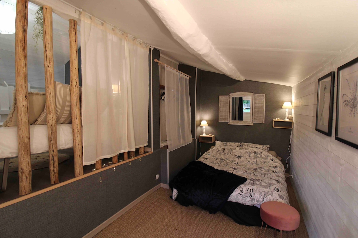自然の中心部にある25平方メートルの独特な小屋をお楽しみください。 1〜3名様(140cm幅のベッド1台とソファーベッド1台)がご利用いただける静かな小さなココンを建てました。 大きな木製テラスとその素晴らしい夕日をお楽しみいただけます。 私たちの哲学は自然の中心にあり、自然と一致することです。そのためには(外部の)乾式トイレの設置が必要でした。 北欧風呂は専用で、オプションです。