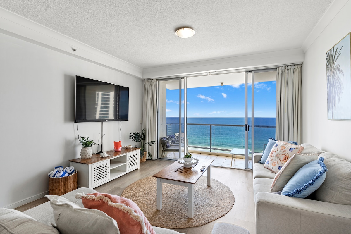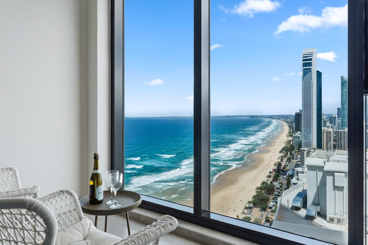 壁から天井までの窓、オーシャンビューの専用バルコニー、道路を渡ったすぐ向かいにあるサーファーズパラダイスビーチへのビーチアクセスを備えた高層階にあるビーチフロントのアパートです。 寝室にはキングサイズのベッド、ラウンジには折りたたみ式のダブルソファベッドが1台あります。設備の整ったキッチン、高速Wi-Fi、エアコン、NetflixとYouTubeが見られるテレビ、無料駐車場、専用ランドリールームが完備されています。 ゲストは、プールの近くと屋上テラスにあるジム、スパ、サウナ、プール、バーベキューをご利用になれます。