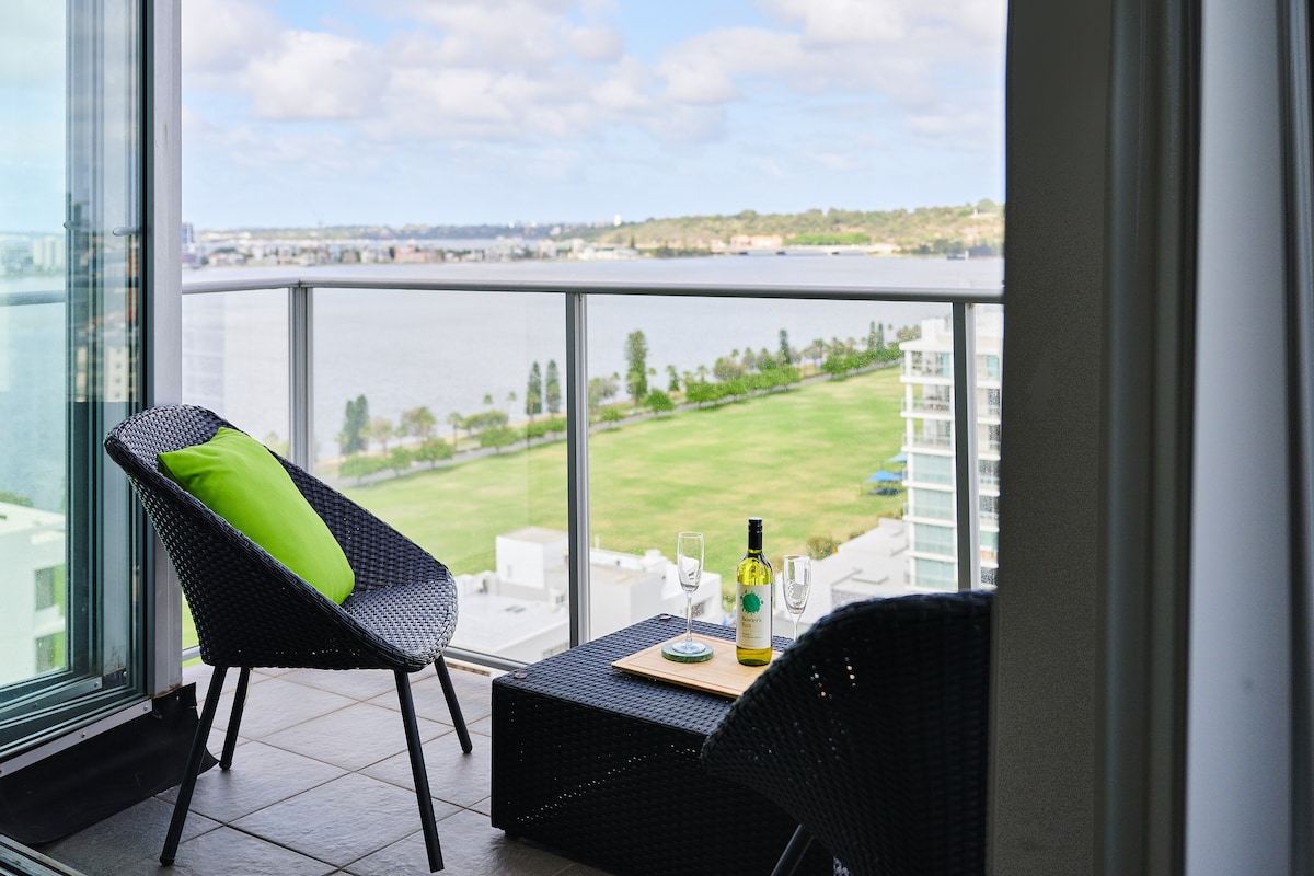 パース中心部のおすすめ:バルコニーからの眺望とユニット内のランドリー