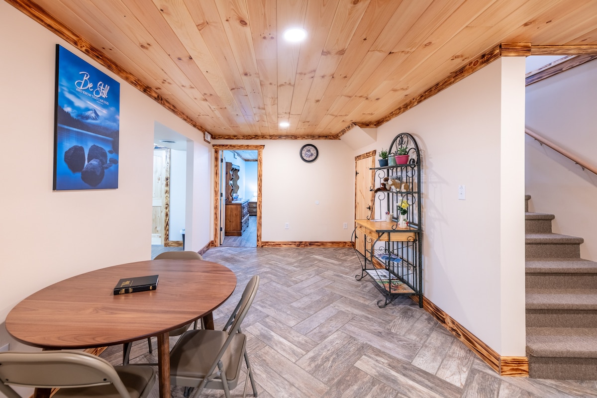 Relax-N-Retreatは、10名様が宿泊できる寝室4室の宿泊施設で、ケンタッキー州ロンドンの美しい丘陵地帯にあります。 1階には、キングサイズベッドと専用バスルームを備えたマスタースイート、クイーンサイズベッドを備えた別の寝室、フルバスルーム、居心地のよいリビングエリア、そしてお料理やお菓子作りに必要な基本的なものが揃ったキッチンがあります。 下の階には、クイーンサイズベッドを備えた寝室2室、簡易キッチン、フルバスルームが備わっています。