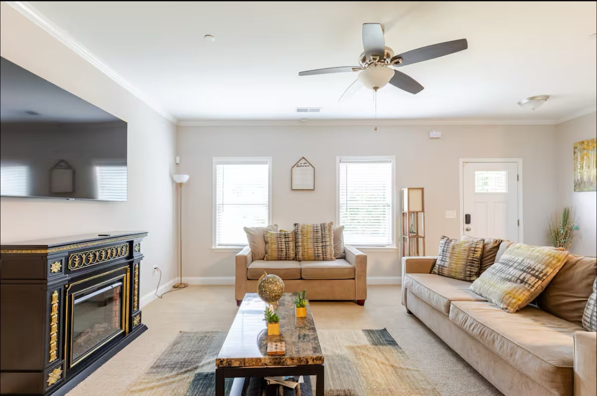 Welcome to our Airbnb home where comfort and luxury blend seamlessly! This spacious retreat boasts 3 bedrooms, each with a private bath, as well as a kitchen, dining and cozy lounge area. TVs in every room feature sports and various popular networks, ensuring there’s something for everyone. The fun keeps going with our 5-in-1 game table for some friendly competition. Fully equipped with modern amenities, our Airbnb ensures convenience at every turn. Book to experience this exceptional stay now!