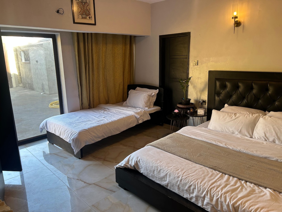 A private room with its own entrance in Darakshan Villas, DHA Phase 6. The room has a double bed (plus an optional single bed), a private attached bathroom, a small private garden, and driveway parking. There’s a mini fridge with soft drinks, a kettle with tea/coffee. Perfect for solo travelers, married couples, and guests who want privacy, comfort, and an easy, peaceful stay in DHA.