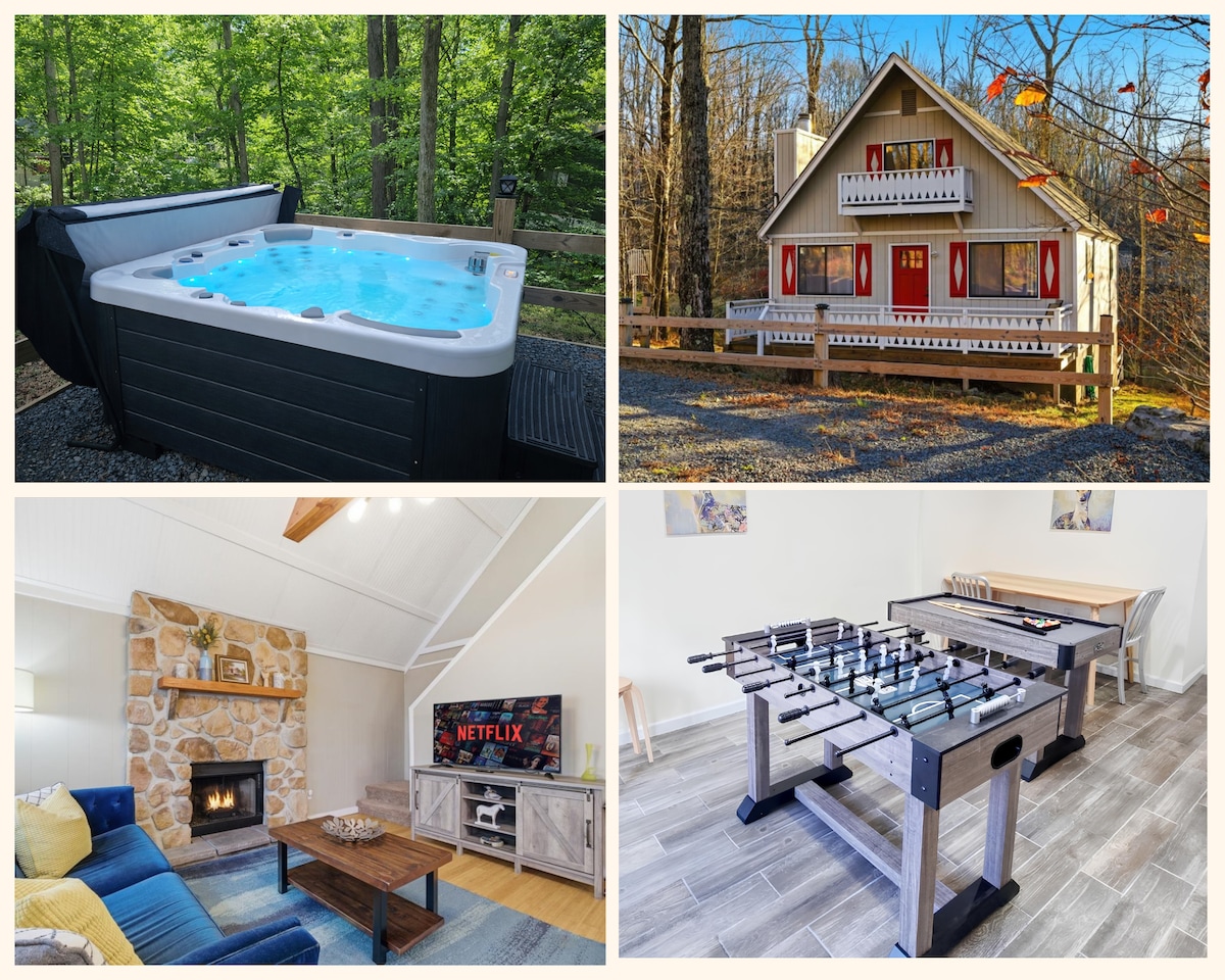 ポコノ山脈に位置する素晴らしいシャレーです。 週末のお出かけにも、年中の長期滞在にも最適な宿泊先です! 屋外では、美しい1エーカーの広い木々に囲まれた敷地内で自然を楽しむことができます。また、ジャグジー、2つのファイヤーピット、朝のコーヒーを楽しめるデッキ、美味しいバーベキューも楽しめます。 私たちの家は静かな雰囲気のインテリアで、ポコノ山脈の季節のアクティビティのすべての近くにあり便利です。 くつろぎたい方も、充電したい方も、私たちの家は完璧な隠れ家です。