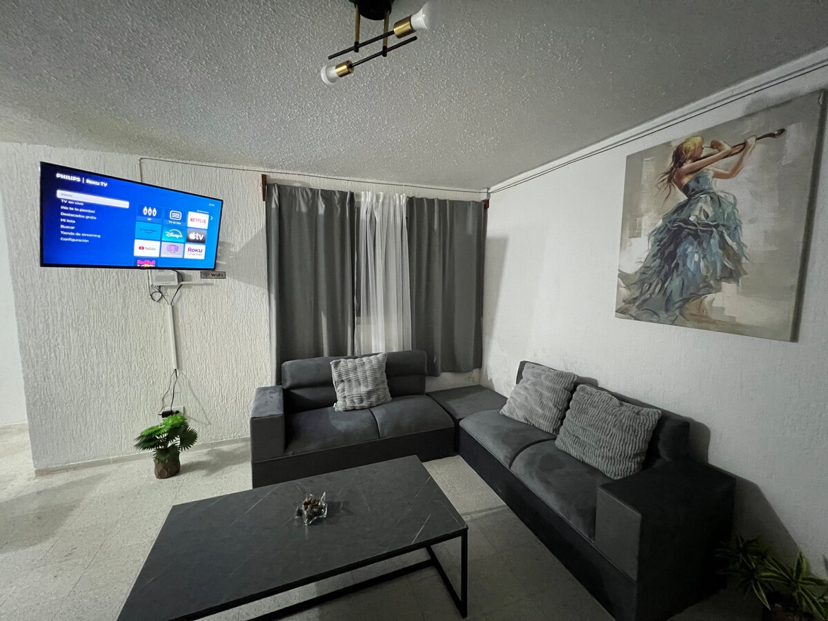 このエレガントな宿泊施設は、休息に最適で、中心部に位置し、アクセスも簡単です。クリスタル広場、スターバックス、サムズは1ブロック先にあります。施設の特徴は以下の通りです。 🔹2つのエアコン付きの寝室。メインルームにはスクリーン、クローゼット、フルバスルームが備わっています。 スクリーン付きの🔹居間。 6人🔹用ダイニングルーム。 🔹キッチンには、電子レンジ、ブレンダー、コーヒーメーカー、コンロ、冷蔵庫、食器セットが完備されています。 🔹1つの共用バスルーム。 リビング🔹ルーム。 🔹バルコニー。 洗濯機を備えたサービス🔹パティオ。