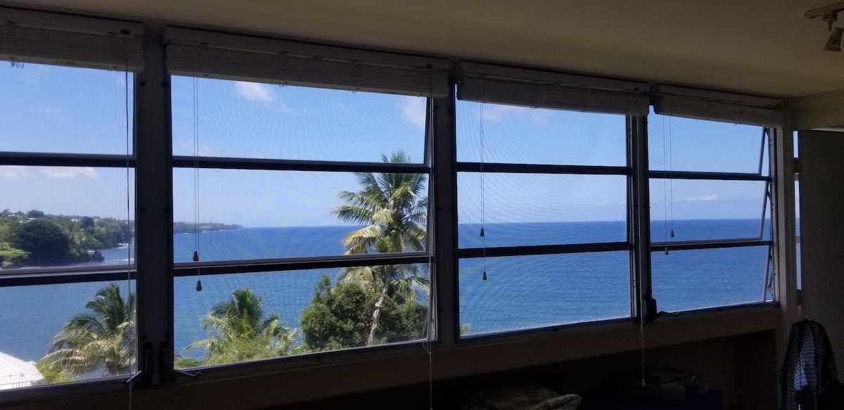 残念ながら、私たちの建物では、ゲストは少なくとも30日間の予約が必要です。 海を直接見渡せる、新しく改装された明るいコンドミニアムで、緑豊かな木々に囲まれた歴史的建造物の中にあります。 パノラマビューを楽しめる広いラナイをお楽しみください。 一年中安全に泳げ、近くのビーチを選択でき、ヒロで必要なものすべてに近いです。 くつろぎ、リラックスし、カメと泳ぎ、屋外マーケットを訪れ、料理をし、夜は波の音を聞いてください。 繰り返しましょう。完璧でストレスのない休暇です。