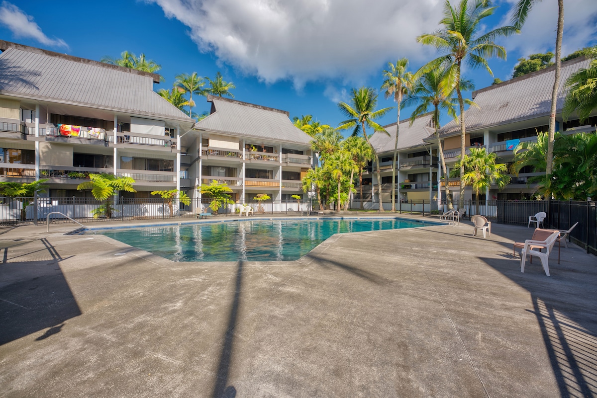 中心部に位置するこちらの宿泊先の近くには、ショッピング、レストラン、アクティビティ、ビーチ、ヒロ空港など、家族で訪れたい場所がすべてそろいます。 ワイロア川州立公園から徒歩ですぐの場所で、美しい植物の景色を楽しみ、ハワイアンゴース、アヒル、鯉を見ることができます。または、プールとワイアケア池を見渡す広いバルコニーで、モーニングコーヒーをお楽しみください。 リモートワーカー、旅行看護師、小さな家族、学生に最適な場所です!