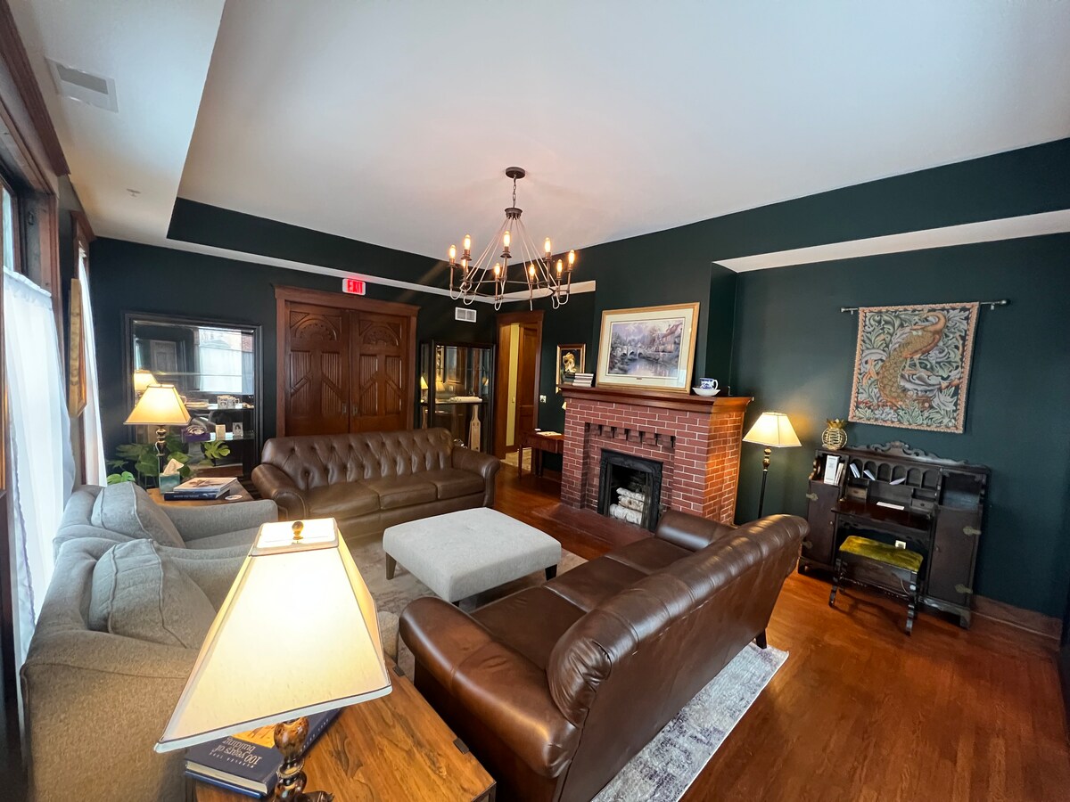 イリノイ州チャールストンの田舎の中心部に位置する私たちの家は、オブライエン・フィールド(EIU)と歴史的なダウンタウン広場の中間にあります。このゴージャスなデザイナーズハウスとオーナーズスイートは1968年に建てられ、本当にユニークな休暇を過ごすことができます。広々とした家には、2階建ての石壁、特大の窓、螺旋階段、ゲームホール、ビリヤードルーム、100%シダーのウォークインクローゼット、マスターベッドルームのシャワー、装飾的なアンティーク鋳鉄暖炉があります。